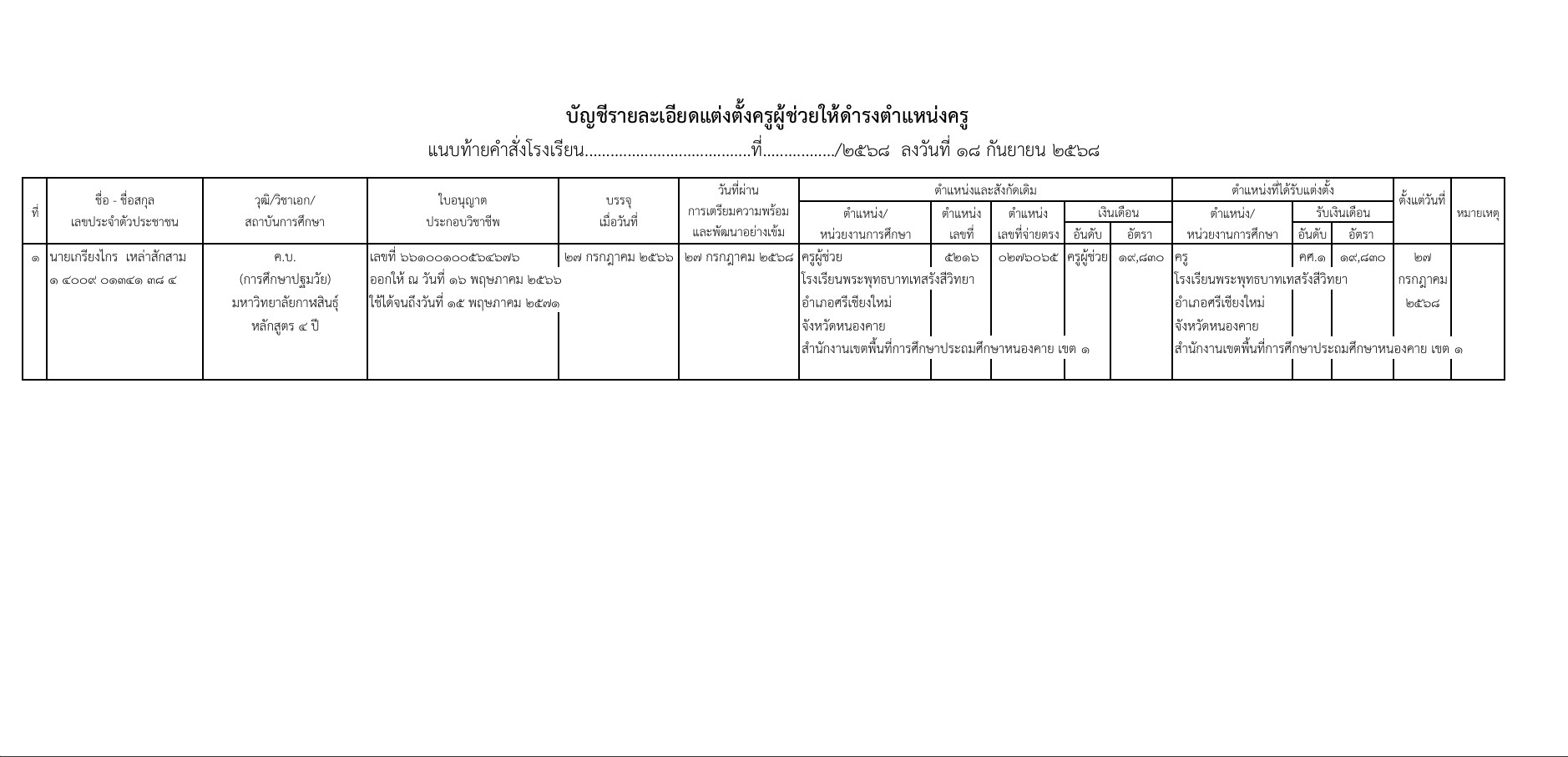 แต่งตั้งครูผู้ช่วยให้ดำรงตำแหน่งครู (นายเกรียงไกร เหล่าสักสาม)