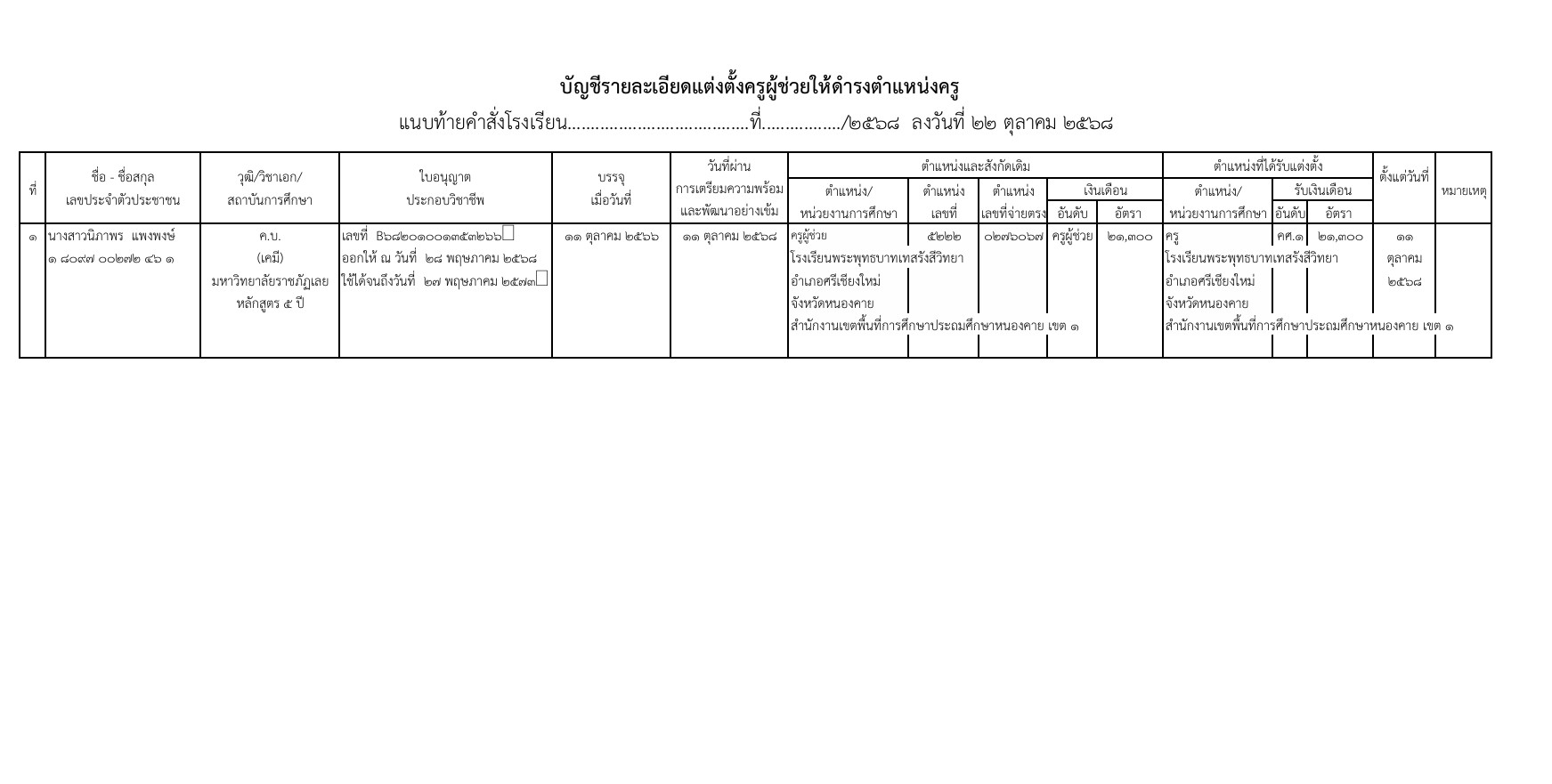 แต่งตั้งครูผู้ช่วยให้ดำรงตำแหน่งครู (นางสาวนิภาพร แพงพงษ์)